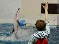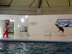 カマイルカはボールを運んだりジャンプをしたりと結構多彩な芸を披露してくれます。会場はやや古びた感が有り水槽の鉄骨も錆が有りで残念です。 | ![]() |