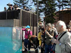 アシカショーが終わると外ではゼニガタアザラシのエサやりです。丸いドーナツ型の水槽で、丸い部分全てに海水が注入されています。下の一部が水面なのですが、中に海水が注入されているためアザラシがクルクルまわり芸を披露してくれます。 | ![]() |