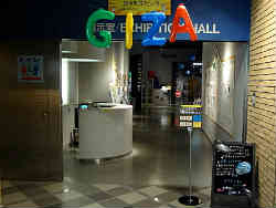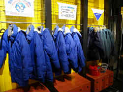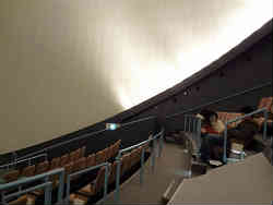 右はアストロビジョンと言って星空を映し出すプラネタリウムと同じで、流氷の世界を半ドーム型の天井に映し出す装置です。映像は撮影禁止なので上映前の会場です。客は二組のみのガラガラ状態でした。左はマイナス20度の世界を体感できる流氷水族館です。防寒用のジャケットや手袋・耳当てなども貸してくれます。面白いことに湿気ったハンカチやシャボン玉も貸してくれます。 | ![]() |