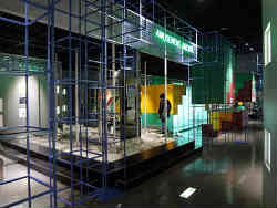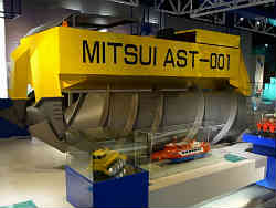 右は流氷ができて接岸する様子を段階的に説明する装置です。左は戦車のキャタピラに当たる駆動装置を巨大なネジにすることによって移動する車です。ネジに相当する筒状の所は空気が入っており浮力となります。ネジを回すことにより木材の中に入り込んでいく理屈と同じで、この車で流氷の上を砕きながら進んでいくことができる乗り物です。それを進化させたのが下部の流氷観測船ガリンコ号です。 | ![]() |