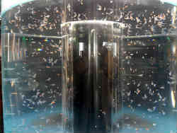 右は日本一の量を誇るクリオネが入った水槽(クリオネハウス)です。左は過冷却水観察装置で、水道の蛇口から凍らない0度以下の水が衝突の衝撃で氷に変化しポタポタとしたたり落ちる場所にまるで鍾乳洞のように氷が積み重なっていく様子が見て取れます。 | ![]() |
