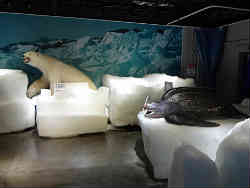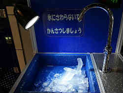 中に入り地下に下りると氷の世界です。北極をイメージした部屋の横には本物の魚が本物の氷に閉ざされ展示されています(水族館)。管理員のおじさんに写真を撮って貰えました。ハンカチもすぐに凍ります。 | ![]() |