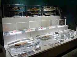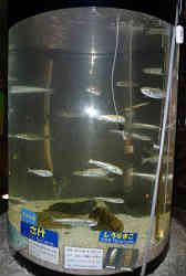 タワーに入ります。エレベータが有り、地下1F・地上3Fまで自由に行けます。地下の窓にはオホーツク海が見える窓がありますが、海水が濁ってほとんど何も見えません。左はサケの稚魚と下にはシロナマコがいます。海水はやや濁っています。 | ![]() |