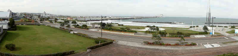 右は展望台から紋別の海とオホーツク海を見ています。左はこれから行くオホーツクタワーが遠くに見えています。望遠で撮っています。下記はパノラマ風景写真です。 | ![]() |
