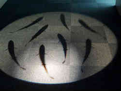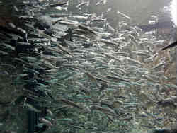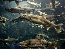 サケ(シロサケ)の稚魚が無数(本当は約2000匹らしい)に泳いでいます。そして横には大きなサメなどの大きな水槽があります。 | ![]() |