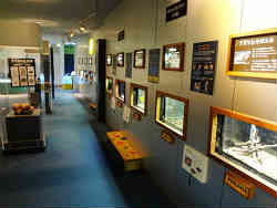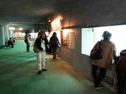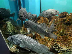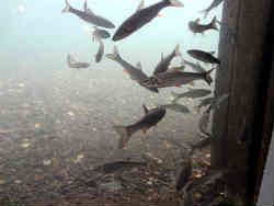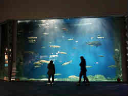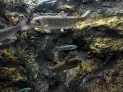 右は海水魚のエゾメバル・クロソイ・シマソイです。どこも同じですが、ほとんど動きがありません。じーっと漂っているだけです。左はここのメインだと思いますが、外の千歳川の側面をガラス越しに覗ける水槽?です。実際の川の流れが手に取るように判ります。サケの稚魚も柱に隠れて流れから身を待避させている様子がわかります。 | ![]() |