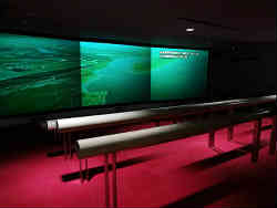右はギンザケの稚魚です。左は鮭の一生や遡上についての映像を前方三つのスクリーンに映写している部屋です。ここもガラガラでしたが、やはりアジア系の外国人が多く入ってきました。 | ![]() |
