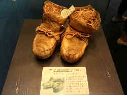 右はアイヌの靴でサケの川で作って展示しており、その下には本物を触ることができます。結構固かったので実用的かもしれません。左は出入り口付近に丸い水槽で展示しているベニザケです。国産のベニザケを回帰させようと実験飼育をしているみたいです。実際に3河川で放流事業をしているみたいです。 | ![]() |