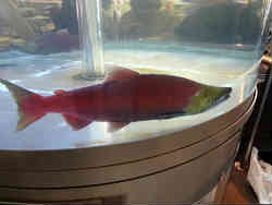 その隣には大きなサケがうじゃうじゃ泳いでおり、しかもケンカもしていますので迫力あります。鋭い歯で噛みついたりしています。 | ![]() |