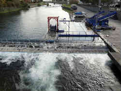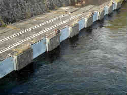 右は上記説明の千歳川の横をガラス面で覗ける水槽?を外から撮影した箇所です。青い壁とコンクリートの柱が交互にありますが、その水面下で窓が設けられています。左は実際の施設でインディアン水車を使い遡上してきたサケを自動的に捕獲する仕掛けです。このサケの抱卵した卵を別の施設で取り出し人工授精させて放流するのだそうです。 | ![]() |