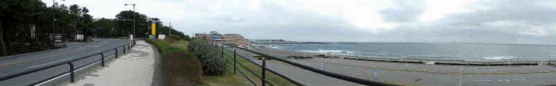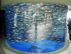上記は遠くに水族館が見えています。パノラマで撮影しています。近づいて右は入り口です。入ると他の水族館でも入り口にあるイワシの水槽です。群れをなしくるくる回っています。 | ![]() |