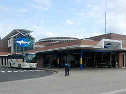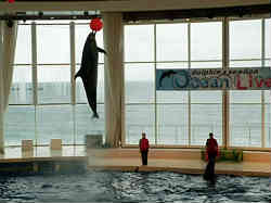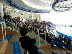 イルカとオキゴンドウクジラのショーです。会場はすべて屋内で後ろの窓には海が広がっています。大きさも結構大きいのです。 | ![]() |