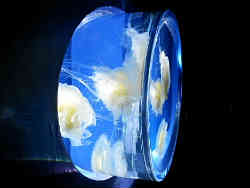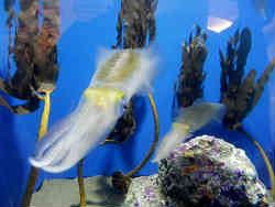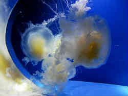 これはサムクラゲと言い一般的なミズクラゲの一種です。おもしろいのはこの水槽で横から見ると円柱形に出っ張っています。丸い半球形はよくありますが・・。 | ![]() |