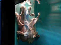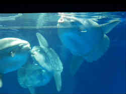 右はマンボウで、よく見ると水槽の周りには透明に近いネットが張られており、衝突の際のクッションとなります。それほどかなりデリケートな魚です。捕食のシーンと解説も見ることができます。 | ![]() |