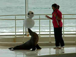 アシカはここでも片手での水平立ち(前回の鴨川シーワールドでもあったので)を披露した。左は何とボール二つを同時に乗せバランスを取るという初めての芸?かと思われたが、これはインチキですぐに種明かしをしてくれました。磁石でひっつけているとのことです。 | ![]() |