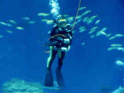 その大水槽でのショーです。女性のダイバーが泳いで現れ魚たちにエサをやり、水中カメラで詳細な映像と説明を送ってくれます。観客の横のモニターにはその水中カメラの映像がリアルタイムで送られ、外にいる係員とのやりとりも絶妙です。 | ![]() |