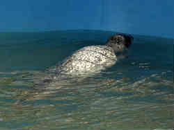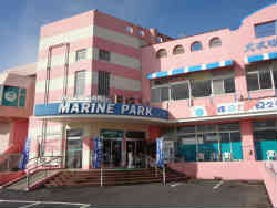 右は水族館の外観の建物で手前にはイルカショーの会場がちらっと見えています。左は隣のゴマフアザラシの水槽です。2匹いてますが、水質等は問題有りかもしれません。しかし若い女性の飼育員の方が水質を計っているので健康には問題ないと思いますが、拝観料を取って観察という観点からは問題有りですね。 | ![]() |