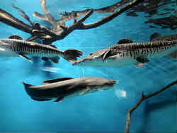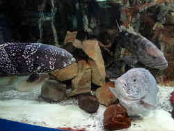 入ってすぐに真アジの水槽です。予算が無いのか水は濁り気味です。左は世界のナマズと言うことでオキシドラス・ヘテロブランクスクララ・ボドワードという魚です。良い言い方をすれば手作り感ある水族館ですが、悪く言うと予算不足というのが否めません。説明文もすべて紙に手書きです。まるで幼稚園児の工作みたいです(文字は綺麗だが)。 | ![]() |