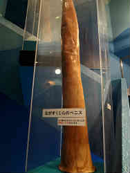 右はナガスクジラのペニスで2本あります。展示品ではおおよそ1.5m程度ですが、説明文では実際にはこれの約3倍あるそうです。剥製にすると縮むのだそうです。左は大型魚コーナーのツチホゼリ・クエ・タマカイという魚です。クエは大きく1mは超えていますね。 | ![]() |