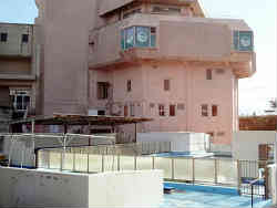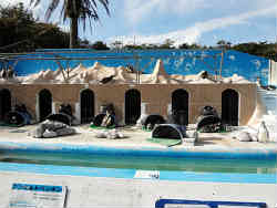 最後は高さ5m程度の棒の先端にタッチ(他はボールを使うがここでは飼育員が棒を持って)する演技です。観客席の屋根もボロボロで錆だらけです。最後はプールの縁に上ってご挨拶で終了です。観客数は20人程度でしょうか?。ちょっと気の毒な感じもします。 | ![]() |