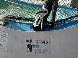 イルカショーまでは時間があるので近くのペンギンコーナーに見に行きます。他の観客はゼロでペンギンたちも暇をもてあましています。種類はフンボルトペンギンであまり掃除も行き届いていません。左は実際にはこの種のペンギンはかなり重たいらしく人形を使って表現しています。4.5kgあって実際に持つとずっしりかなり重たいのが判ります。ペンギンは見た目鳥で軽く思われますが、水中に潜るためかなり重たいのだそうです(どこかの説明で覚えています)。ちょうど素潜り等で腰に鉛のベルトをはめるのと似ています。 | ![]() |