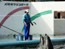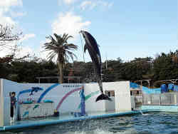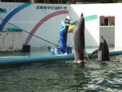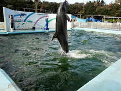 さんざん時間をもてあまして最後にイルカショーの時間です。最初トレーニングを見ている時係員の方は私を見て(私一人のみ)会釈をしてくれて態度は好感を持てます。さきほどのアザラシの所の女性も挨拶をしてくれます。ショーは一人が司会をそして他の飼育員一人の合計2人で進められていきます。水槽と会場はかなり狭い方で特に囲ってあるアクリル板が太陽光でくすんでいる(あせている)のが問題です。始まる前には若い女性飼育員がアクリル板に水を掛け少しでも見えるようにしていますが、ほとんどの年老いた観客は立ってみてます。私も角の一番見えやすいところに陣取って写真撮影です。当然海水がかかりますので必死でしゃがみます。 | ![]() |