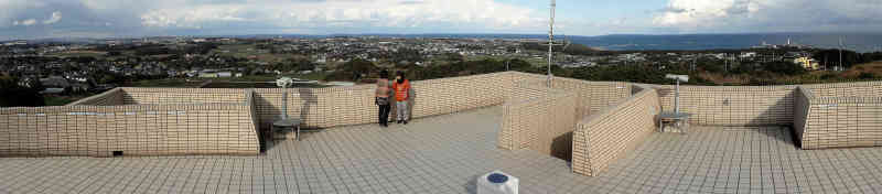 そして近く(といっても30分歩き山の上)の「地球の丸く見える丘展望館」に立ち寄り見学しました。さすがにうたい文句のあるように360度一望が出来ます。約3/4は海が見え、残りは陸地です。右ははるか先(銚子あたり?)に風力発電のプロペラが群で見えています。左は東の海の上に見える海上風力発電のプロペラだと思われます。下は北の方角をパノラマで撮影した物です。 | ![]() |