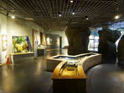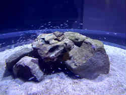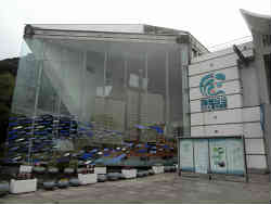 ここはこの水族館のメインである大水槽です。おおよそ幅10m弱、高さ5m程度です。この水族館の水槽は非常綺麗なものでよく掃除が行き届いています。上部にはイワシの群れがくるくる回って泳いでおり、その下にはアジがあまりイワシほど群れを作らず遊泳しています。その他にサメやエイ・底にはヒラメといてます。 | ![]() |