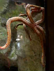 右は入ってすぐのエビのコーナーで、ニシキエビ・イソギンチャクモエビ・セミエビ・モエビが入っています。まるで触れ合いコーナーみたいですが違います。触れるコーナーも別に有り、触った後は水道と乾燥機が付いてあり施設的にはずいぶんとお金を掛けていると言った印象です。施設もすごく綺麗です。左は大きなヒトデです。これは足の長さはゆうに30cmを超えており、ガラス面にへばりついています。 | ![]() |
