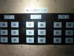 右は魚偏の付いた漢字をあてるというゲーム形式のお遊びです。上級は難しかった。左は小さな魚がいますが、ゴマハゼという魚種で体長2cmまでしか成長しません。絶滅危惧U類に指定されている珍しい魚です。 | ![]() |