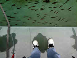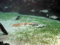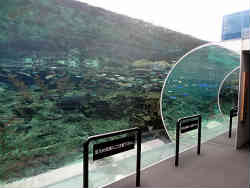 上記大水槽の横にはちょっと変わった水槽があります。円筒形を半分に切ったような水槽で長く見えますが、向こう側は鏡になっているので短いのです。また足元にはスケルトンの廊下みたいな工夫がなされていてちょっとした怖さを感じることができます。私の足が見えている箇所がスケルトン状のアクリル板です。 | ![]() |