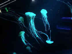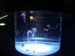 ![]() ここの特徴の一つにクラゲの展示コーナーが贅沢に空間を使っているということです。種類はさほど多くも無いですが、優雅に舞う種類を展示し、天井にはプラネタリウムみたいにクラゲの絵を映し出しています。また下に通じる階段にもクラゲを映し出して(左写真)います。 | ![]() |
