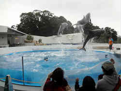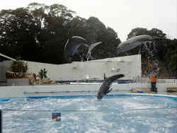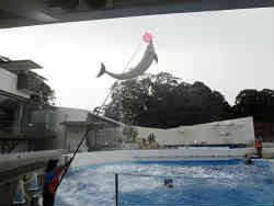イルカショーで一番驚いたのがサッカーのオーバーヘッドキックなるものがありました。プールに投げ込んだボールをイルカ自身が口で上に跳ね上げ、そのまま水面より3mぐらいまでジャンプしそのボールをダイレクトに尻尾でオーバーヘッドキックをしてボールが場外に飛んでいきました。左写真は口でボールを水面に上げて尻尾で蹴る前の写真で、背面でジャンプしこの体勢から尻尾で後方へ蹴りました。 | ![]() |