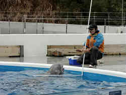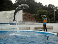 入場して1時間20分後に始まる第一回のイルカショーです。これを見るためにかなりの時間をつぶしました。ここのプールの規模は小さいのですが、いきなりイルカのジャンプから入ります。バンドウイルカ2匹、オキゴンドウクジラ1匹による共演が始まります。右写真はオキゴンドウのジャンプの調教の様子を披露してくれました。このようなL字型の棒で、最初は水中で通過させて徐々に水面に近くまで上げていき、成功すると誉めてエサを与えると言うことを繰り返すそうです。次に水面へと展開し最後は大きなジャンプが出来るそうです。 | ![]() |