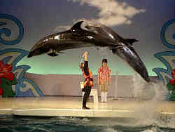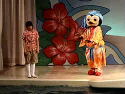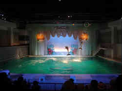 何故か沖縄をテーマにしたストーリーとなっています。アロハシャツを着たお姉さんとゆるキャラがステージに立って進行していきます。観客席は常に薄暗く照明の効果を出しています。イルカもジャンプをして盛り立てますが、イルカもジャンプも種類は多くありません。 | ![]() |