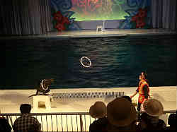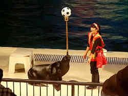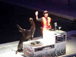 次にアシカの芸ですが、曲を演奏すると言うことで、右の写真はオルガン?でお姉さんの指示通りのけん盤を鼻先で押して鳴らします。左はDJのような感じでレコードを回しときたま鼻息で音を出します。楽曲はイッツアスモールワールドの曲でなかなか合っていて面白かったです。 | ![]() |