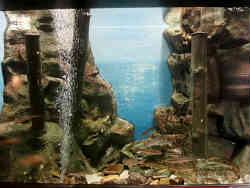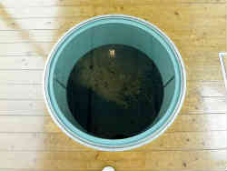 右はヤマトシジミの水質浄化実験中の水槽です。ヤマトシジミは浮遊中のバクテリアやプランクトンなどの有機混濁物をエサにしているのです。クロレラが入った水槽で、左はヤマトシジミが入っていない物で、ミドリに濁ってきています。右はヤマトシジミを入れているので濁ってきません。左は渓流の女王「ヤマメ」です。川上に生息するサケの一種です。海に下りた物は「サクラマス」と呼ばれています。ヤマメに似た魚でアマゴが居てます。アマゴには体の表面にヤマメには無い朱玉の斑点があり、生息分布は基本的に違うのですが、放流によりよく似たポイントへの生息が確認されつつ有り、また純正のヤマメも異種交配により少なくなってきているそうです。 | ![]() |