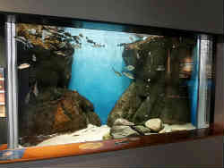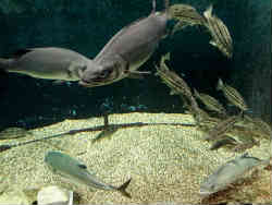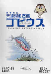 淡水の水族館はどこも綺麗です。おそらく汚れが付きにくいのだと推察します。右は出世魚スズキのコーナーです。名前の紹介にセイゴ→チュウハン(フッコ)→スズキと説明があります。我々関西人ではフッコの部分がハネですね。スズキも汽水域に住んでいる魚です。左は中海の魚ですが、この水族館「ゴビウス」の名前の由来はハゼなどの小さな魚の総称でラテン語でゴビウスと言うらしいです。この宍道湖や中海ではたくさんのハゼが居て特にマハゼはこの辺でゴビと呼ばれ親しまれているそうです。ここのマスコットキャラクターはゴビイと言い英語ではハゼの事をGobyだそうです。 | ![]() |