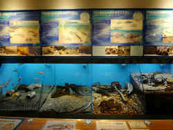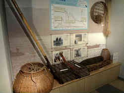 右はシジミ取りの道具です。基本的には手でカゴ付きのクマデで砂ごと掘り起こし、シジミのみ丸カゴに入れていきます。右は中海と海というコーナーでギンガメアジ・ヒラメ・カサゴ・シマイサキ・クロソイなどが展示されています。 | ![]() |