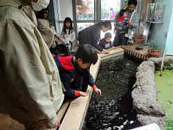 入ってすぐのタッチングプールです。ここは珍しく魚に触れる事ができ(他では無難なヒトデやナマコなどが多い)、また無料のエサが常備しており、気軽にエサをやることができます。そして小さな水槽が並んで一般的な魚が鑑賞できます。 | ![]() |