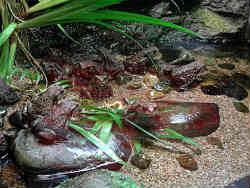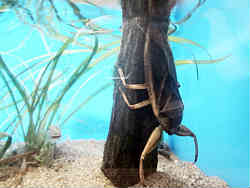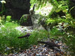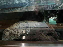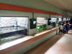 右の水槽はイモリとヤモリです。イモリは両生類でサンショウウオやカエルの仲間で水中でふ化し大きくなると陸上と水中の両方で生活します。一方ヤモリは爬虫類でトカゲやヘビの仲間です。都会にも住んでいることが有り、塀やガラスにも張り付いていることがあります。左は見えにくいですが両生類のオオサンショウオです。世界最大の両生類です。最高では1.5mほどの大きさになります。国の特別天然記念物に指定されています。 | ![]() |