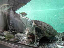 右はカミツキカメで北アメリカ原産です。あごが強くかまれると非常に危険です。この井の頭の池に放された(捨てた)亀を捕獲し育てています。左はヤマメとニッコウイワナです。 | ![]() |