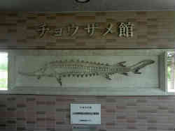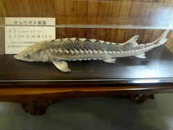 ここのチョウザメ館は美深町の森林公園びふかアイランド内にあります。付近には道の駅やオートキャンプ場がありその中の一角にあります。中に入ってもわからず係の人に場所を聞きました。ちょっと案内が不親切だと思いましたが、まあこれだけを見学に来る人も居ないでしょう(私は特殊だと自負)から仕方ないですかね?。無料なので入ってすぐに受付用紙に勝手に記入するだけの簡単な物でした。そして自由に見学します。左は入り口付近にあるチョウザメの剥製です。全長146cm、体重18.2kgありました。 | ![]() |
