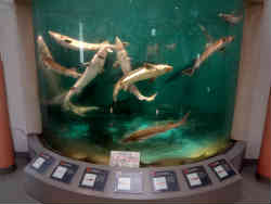 入ってすぐに円筒形のチョウザメだけが入った水槽があります。隣には天塩川の魚たちの水槽があります。さらに奥へと行くと成長段階に分けられた水槽があります。左はふ化後5年程度の水槽で大きくなったチョウザメがいます。 | ![]() |