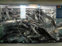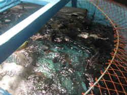 | 右はふ化後1年程度の水槽でおびただしい数の幼魚がいます。チョウザメはご存じ卵はキャビアとして食され、肉も食されます。以前この地域の天塩川に遡上し、放流され現在では人工的にふ化養魚され、この町の産業としています。 | ![]() |