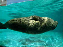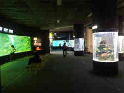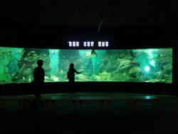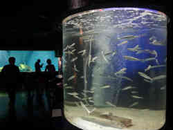 入ってすぐに大きなトロピカランドという水槽があり、アクリル板の厚み78ミリ・水量200トン・水深2.5mです。民間の大きな水族館と違いやはり水質は普通であり建物自体はさほど古くは無いみたいなので残念です。左はサケが回遊している水槽です。西日本ではイワシの回遊が多いですが北の方へ行くとこの手の群れはサケが多いです。 | ![]() |