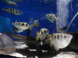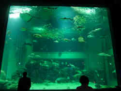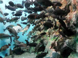 右はあちこちでよく見られるテッポウ魚で、その名の通り水中から口から水を吐き出し水テッポウのごとく地上の茎や葉などにいる虫たちを落として食する魚です。ここのはかなり大きめです。時間が合えばショーも見られるみたいですが今回は見ることができませんでした。左もよくある根魚の群れでメバル・ガシラ(カサゴ)・イサキなどです。メバルはやや上を向いてホバリング(水中停止)しています。ガシラも底にいて動きが少ないですね。 | ![]() |