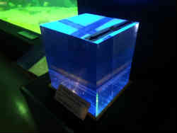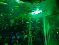 ここがメインの水槽となるマリンジャンボと名付けられている水槽です。約40種2000匹の魚が泳いでいるとありますが、ザアッと見た感じそれほど多くは感じません。水質も今イチですね。左はアクリルの壁の模型で幅7m・高さ5.5m・厚み33.5cm・重さ17トンあるそうです。設置時はこの厚みは世界一だったそうです。 | ![]() |