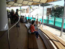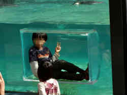 次にペンギンやアザラシのエサやり時間帯が迫ってきましたので見に行きます。水槽前には観覧席が設けられています。右の光景は初めて見ます。子どもが入れる小窓(出窓?)みたいな作りがあります。中に入って皆記念撮影をしています。運良くペンギンたちが来ると一緒に撮影が可能です。これが左右に2箇所あります。 | ![]() |