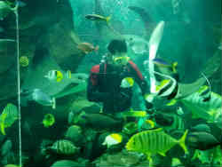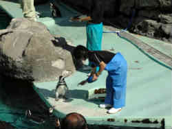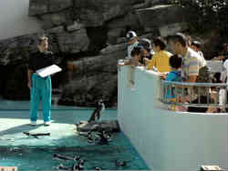 子供達のエサやりが終わっても食べていない?ペンギンたちのエサやりを係員が行っています。今では女性飼育員が必ずいてますね。左はトロピカランドの水槽で男性ダイバーによるエサやりです。最初にエイ達に口の所まで大きめのエサを与えています。その後は小さなオキアミ(アミエビ)みたいなエサを出して他の魚たちにも与えていきます。 | ![]() |